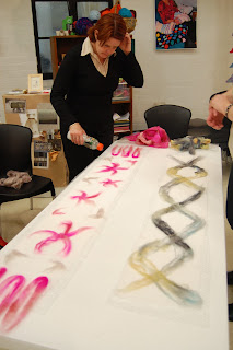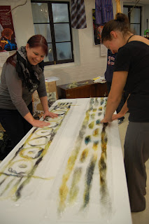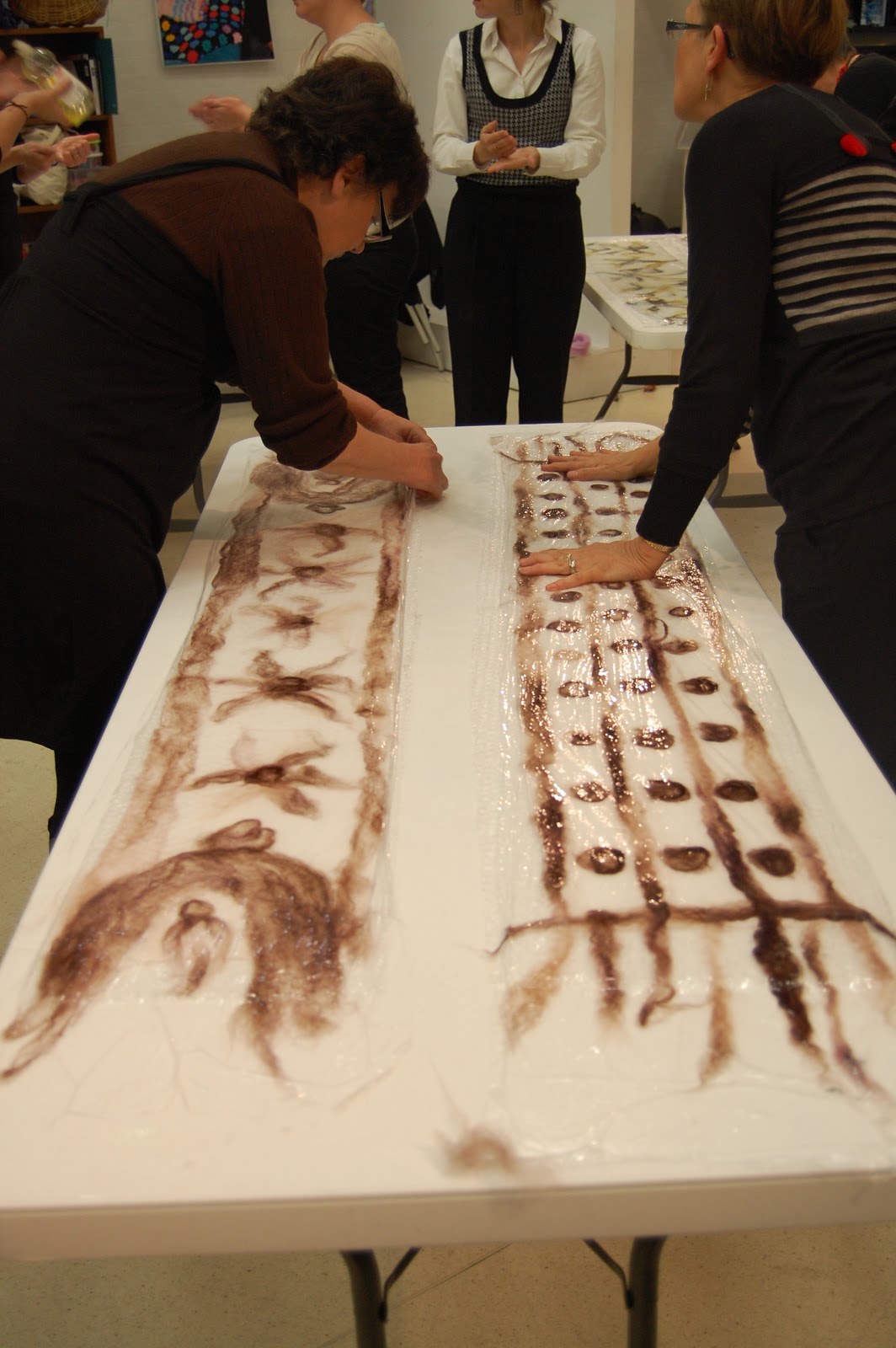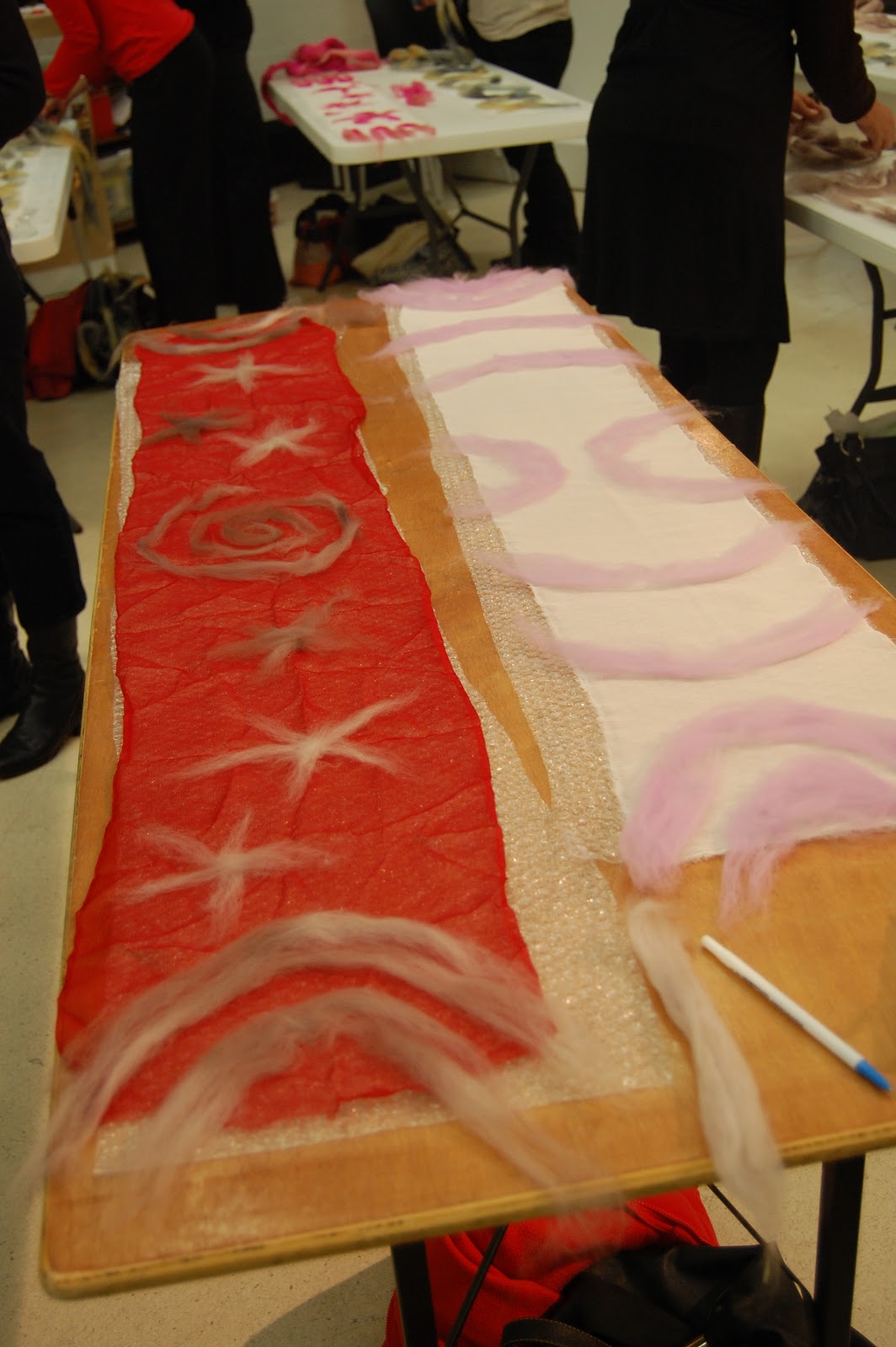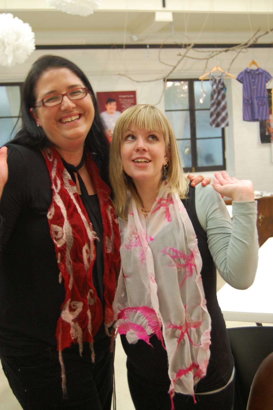 Here we are, my friend Carrie and I at “Saviour of the Lost Arts” about to begin our Nuno Felting scarf workshop.