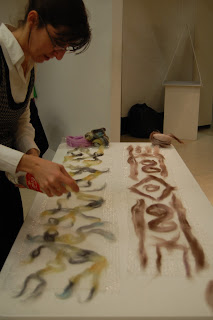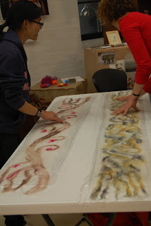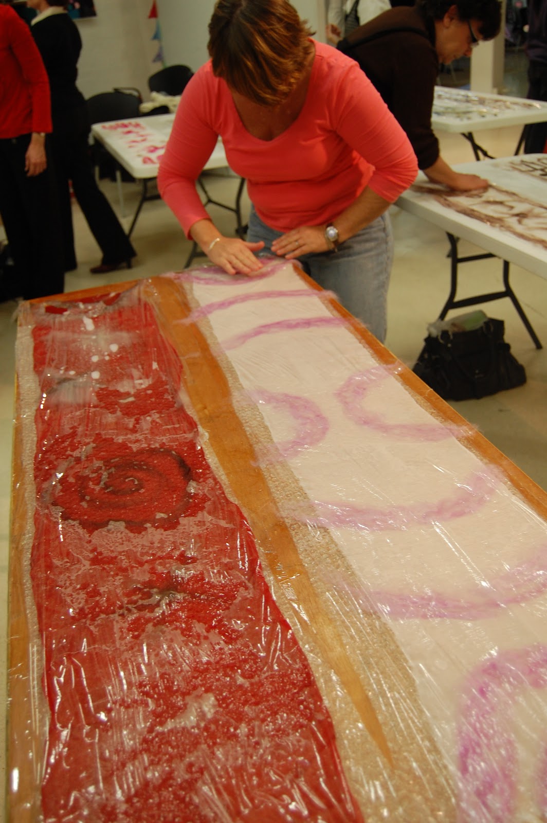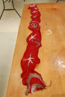 13. The rolling (after the rubbing) helps to knit the wool fibres to the silk and felt the wool. The felting of the wool pulls in the silk threads around it, and begins to create undulations and scrunching in the silk. Roll for about 15-20 minutes, or until you begin to see the silk scarf begin to shrink or narrow around the wool designs. At any time during, or after the rolling, you can begin to stretch and pull out the length or width of the scarf and your design as you see fit.